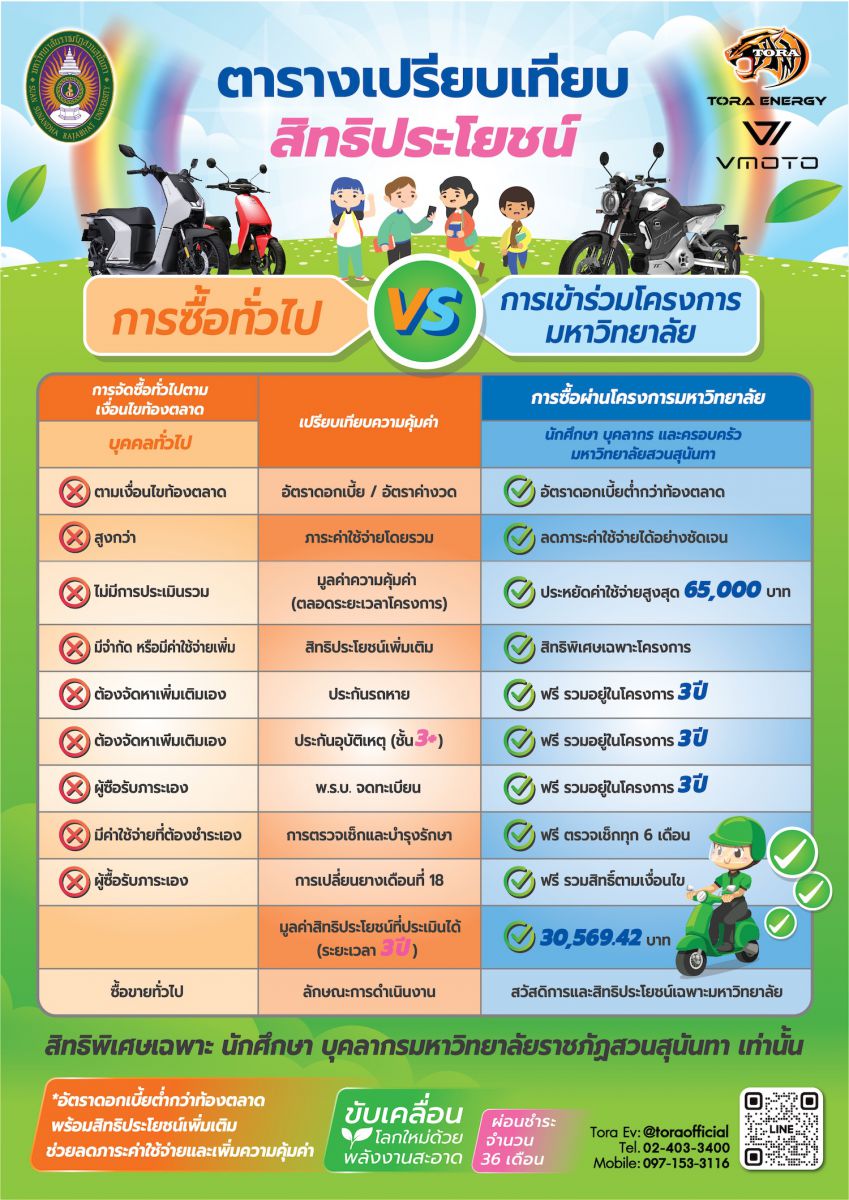 สำหรับบุคลากรทางการศึกษา นักศึกษา และครอบครัวสวนสุนันทาที่เข้าร่วมโครงการ จะได้รับสิทธิพิเศษ อาทิ ฟรีดาวน์ ผ่อนชำระยาวสูงสุด 48 เดือน อัตราผ่อนที่ออกแบบให้เหมาะกับรายได้ ลดภาระรายเดือนอย่างชัดเจน พร้อมประกันตัวรถและแบตเตอรี่ยาวนานถึง 4 ปี รวมถึงสิทธิประโยชน์ด้านการดูแลรักษาและบริการหลังการขายภายใต้เงื่อนไขโครงการ ซึ่งแตกต่างจากการซื้อทั่วไปที่ผู้ซื้อจำเป็นต้องรับภาระค่าใช้จ่ายเหล่านี้ด้วยตนเอง