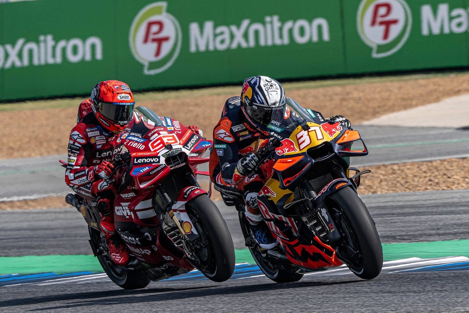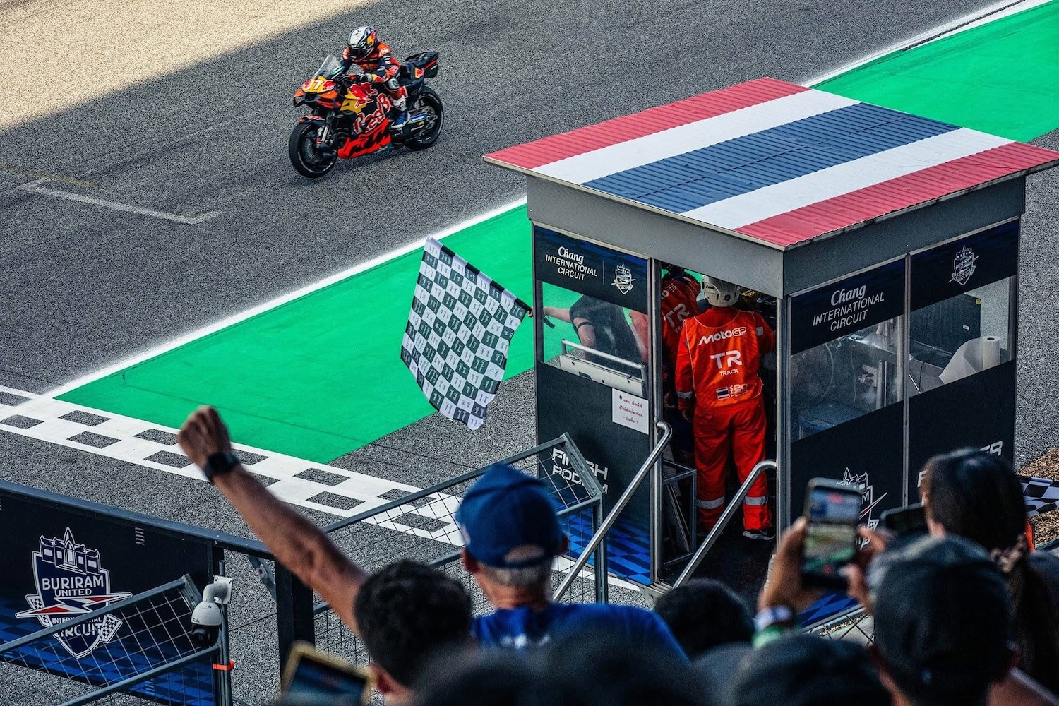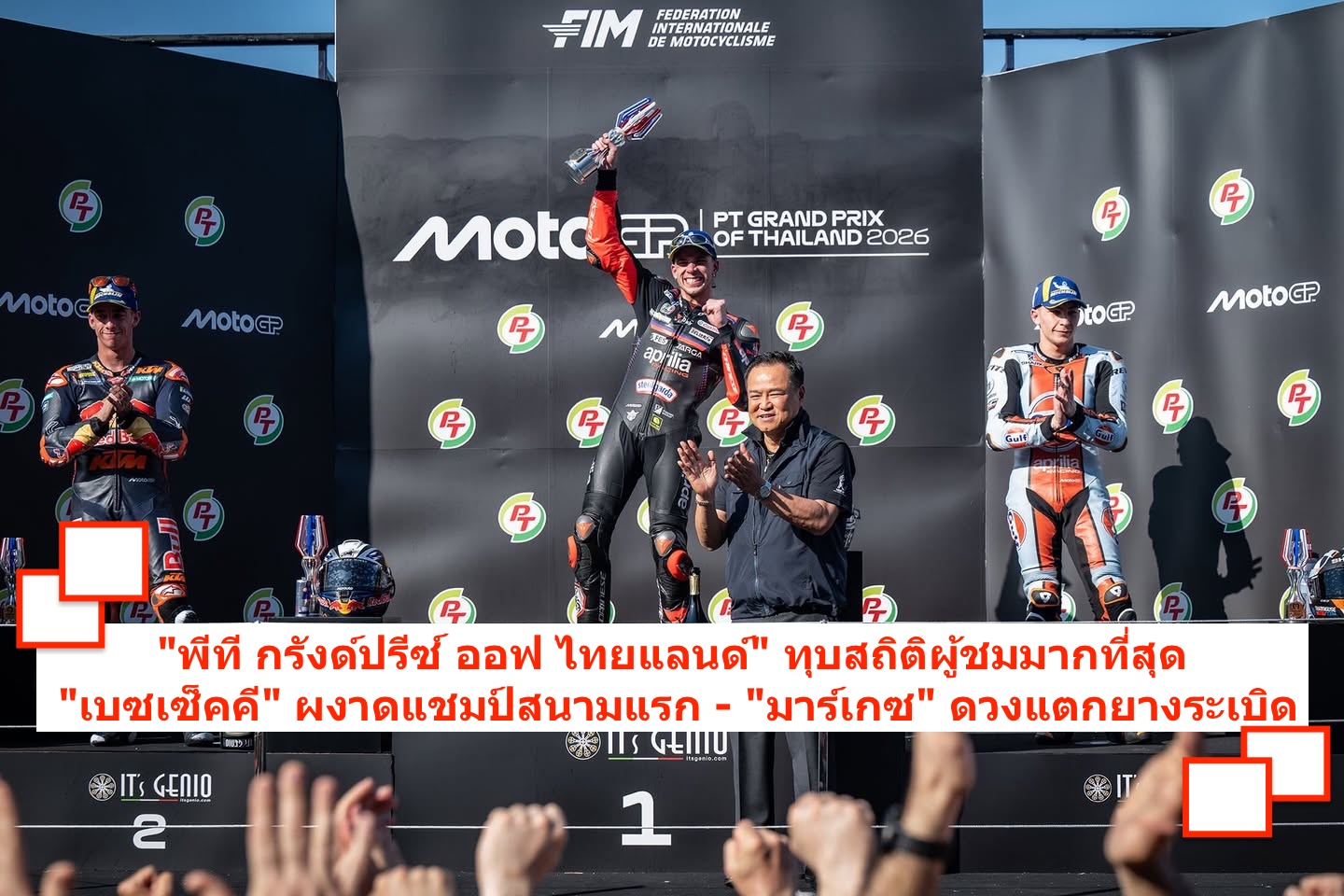ศึกมอเตอร์สปอร์ตสองล้อเบอร์หนึ่งของโลก “โมโตจีพี” ดวลความเร็วสนามแรก ที่ประเทศไทย ภายใต้ชื่อรายการ “พีที กรังด์ปรีซ์ ออฟ ไทยแลนด์” กระหึ่มโลก ด้วยเกมสุดเร้าใจ มาร์โก เบซเซ็คคี ดาวบิดอิตาเลียนจาก อพริเลีย เรซซิ่ง แก้ตัวสำเร็จนำม้วนเดียวจบผงาดคว้าชัยประเดิมฤดูกาลใหม่เหนือ เปโดร อคอสต้า นักบิดสแปนิชจาก เคทีเอ็ม ขณะ มาร์ค มาร์เกซ แชมป์โลกคนปัจจุบันจาก ดูคาติ ดวงแตกยางระเบิดไม่จบเรซ โดยโมโตจีพี สนามประเทศไทยในครั้งนี้ เป็นปีที่ ทำลายสถิติ (Break Records ) ผู้ชมสูงสุดกว่าทุกปี จำนวนกว่า 228,228 คน