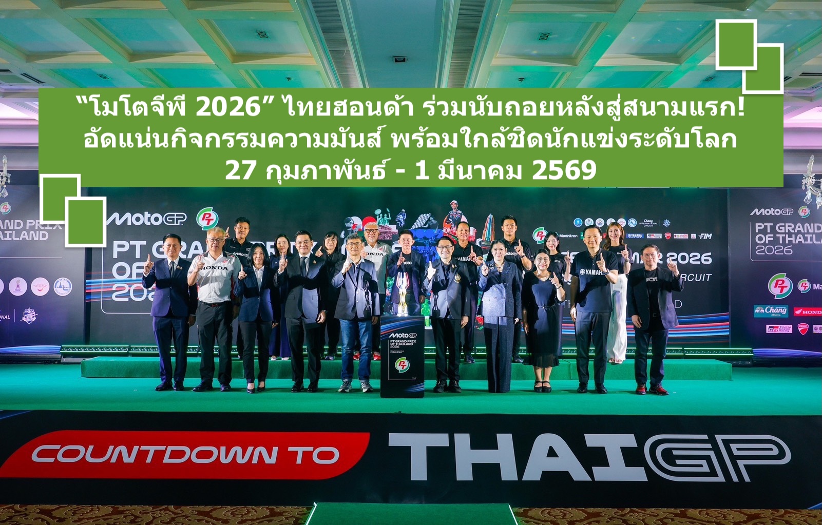 "ไทยฮอนด้า" ร่วมงานแถลงข่าวการนับถอยหลังสู่การแข่งขันรถจักรยานยนต์ทางเรียบชิงแชมป์โลก โมโตจีพี 2026 ในรายการ "PT Grand Prix of Thailand 2026” (พีที กรังด์ปรีซ์ ออฟ ไทยแลนด์) ในศึกการแข่งขันระดับโลกที่ สนามช้าง อินเตอร์เนชั่นแนล เซอร์กิต จ.บุรีรัมย์ ระหว่างวันที่ 27 กุมภาพันธ์-1 มีนาคม 2569 พร้อมเชิญชวนแฟนชาวมอเตอร์สปอร์ต ร่วมเปิดประสบการณ์ความมันส์ระดับโลกไปด้วยกัน เมื่อวันพฤหัสบดีที่ 8 มกราคม 2569 ที่ผ่านมา ณ สโมสรราชพฤกษ์