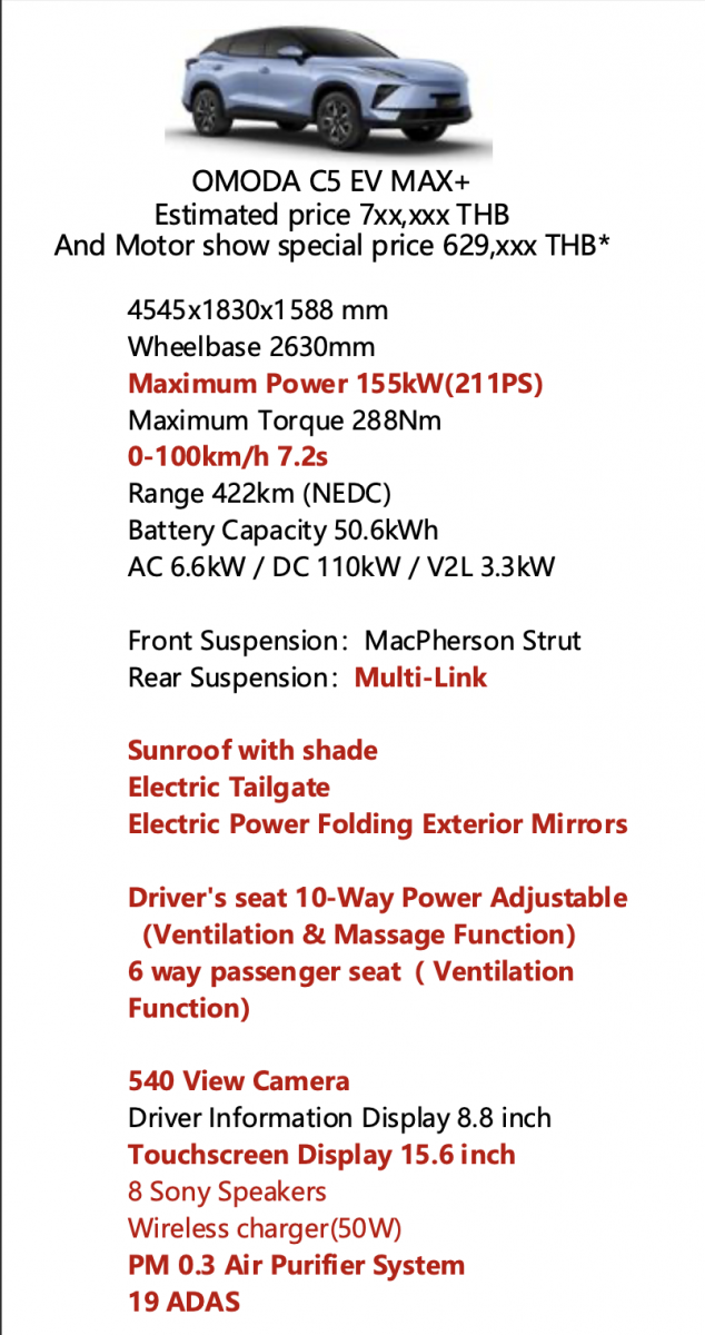 OMODA & JAECOO นำเสนอข้อเสนอพิเศษสำหรับผู้ลงทะเบียนจองสิทธิ์ OMODA C5 EV MAX+ เฉพาะช่วงงาน Motor Show ตั้งแต่วันที่ 23 มีนาคม – 5 เมษายน 2569 ได้รับราคาพิเศษเฉพาะช่วงเวลานี้ 629,XXX บาท จากราคาคาดการณ์ 7XX,XXX บาท และช่วงเวลานี้จะได้รับ Free Lifetime Warranty รับประกันตลอดอายุการใช้งาน ครอบคลุมแบตเตอรี่ มอเตอร์ และระบบควมคุมไฟฟ้า มูลค่า 80,000 บาท, ประกันภัยชั้น 1 และ Home Charger พร้อมติดตั้ง โดยผู้จองจะต้องออกรถภายใน 31 พฤษภาคม 2569 ทั้งนี้ตั้งแต่ 6 เมษายน 2569 ราคาจะปรับเป็น 649,XXX บาท
